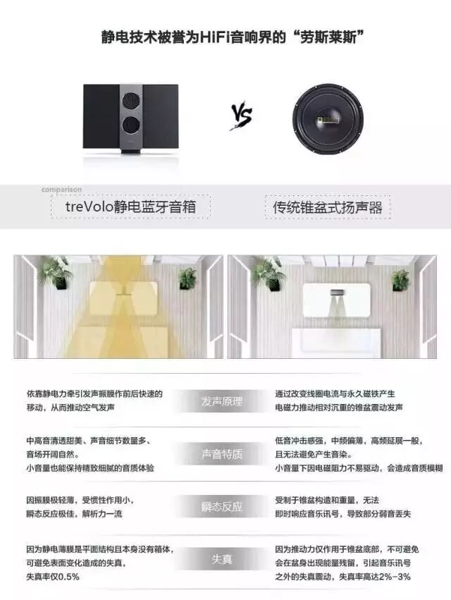 作为一款静电音箱,它与市场上99.9%的音箱都不同:拥有60~20000Hz超广频响范围,且失真率降低到0.5%以下,最大程度上锁住原音,完整而真实呈现音乐的每处细节。无一丝一毫人工干预的痕迹,高音通透自然。