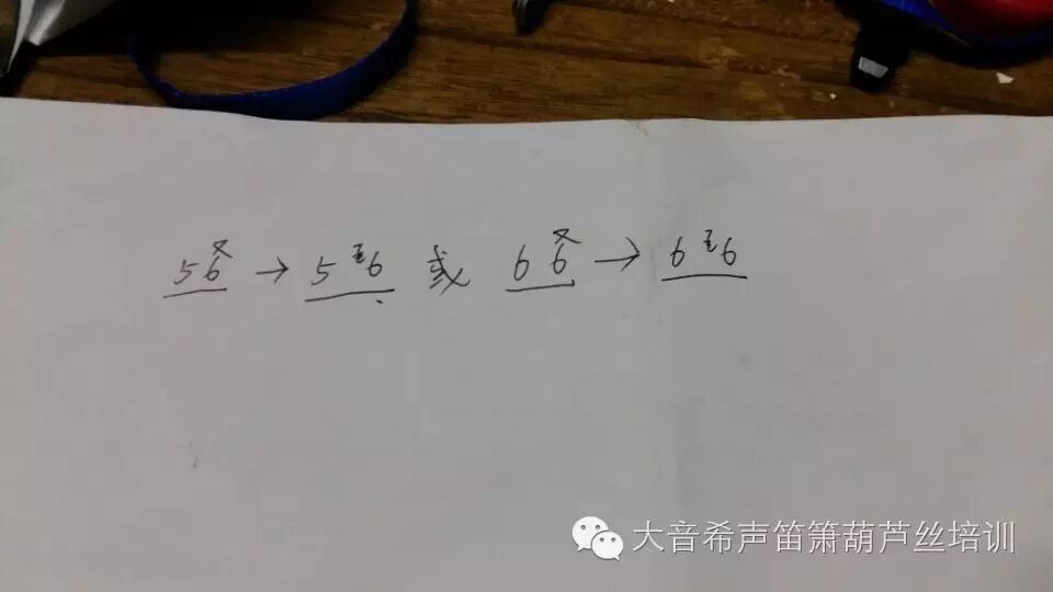 很多初学者在刚刚开始学习叠音的时侯 往往把按上方二度音的手指抬得太高,这样不仅手指会出现笨拙的现象,而且效果已经不是叠音的效果了(类似于笨重错误的倚音)。所以,初学者一定要注意,上方二度音所按的手指在放开时 高度一定要低,时间一定要短促,越短促越好,这样吹奏出来的叠音才会干净自然。接下来我们来做一组练习,注意,节奏一定要慢,但在完成叠音技巧的那一瞬间一定要快。(如图)