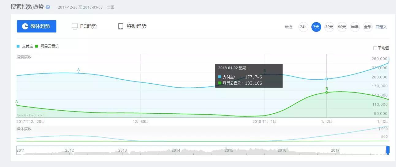 百度指数显示,元旦后云音乐和支付宝的搜索量有明显上升趋势