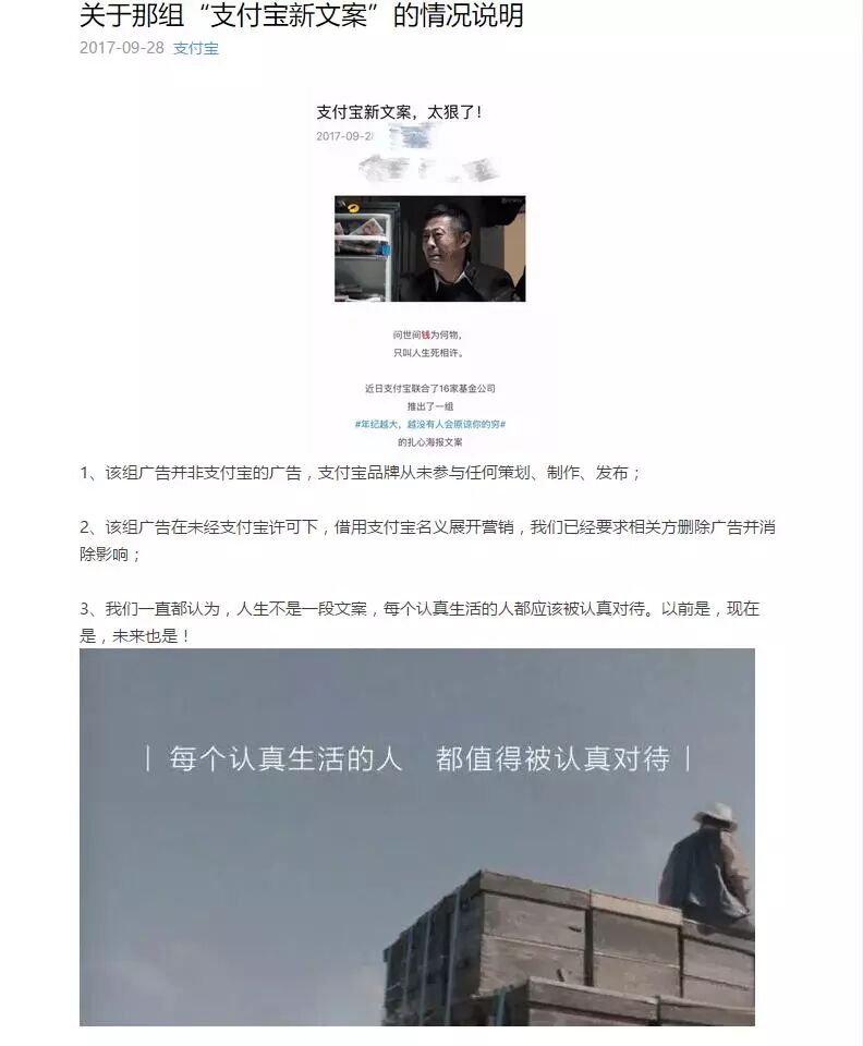 从以往的营销推广中也可以感受到,支付宝似乎离不开“大而全”的品牌形象。而例如去年的“白领日记” 、扎心海报文案,这种“出格”的行为引起用户反对声音后,阿里的后续反应可以说是非常迅速果断。支付宝的战略地位如此重要,出了问题只能“弃卒保帅”。有错认了,挨打站好。好在这种快速跟进的公关行为在同行的承托下,往往能拉拢不少用户的好感。