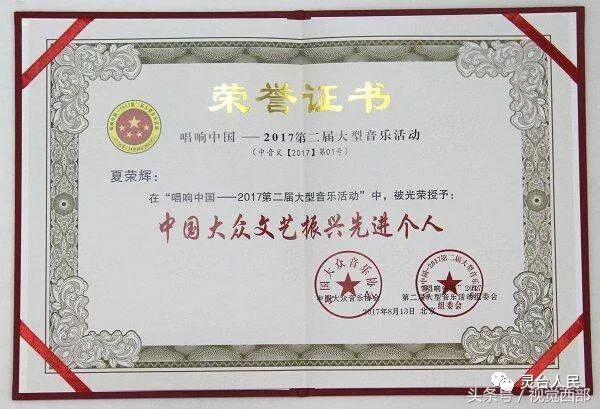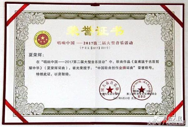 从青春年少,到花甲之年,夏荣辉对音乐痴心不改。,创作了歌曲《我们是祖国忠诚的卫士》,,。、杂志刊登。2013年荣获“美丽中国”全国大型音乐展演活动词曲银奖;再后来又陆续创作了《志愿军忠魂永驻金刚山》等词曲。(来源:新传媒在线网 郭惠民)
