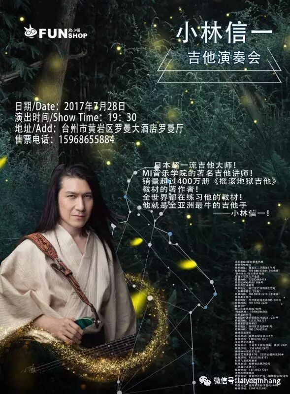 7月28日下午,小林信一空降黄岩,莱野吉他琴行邀小林信一现场给学员授课,一同交流学习。当晚在黄岩罗曼酒店-- 罗曼厅举办演奏会 !号称亚洲最牛吉他手的小林信一的音乐活动不仅限于日本,中国大陆、台湾、韩国、墨西哥等地也有演唱会与讲座巡回公演等,在海外也拥有数以万计乐迷粉丝