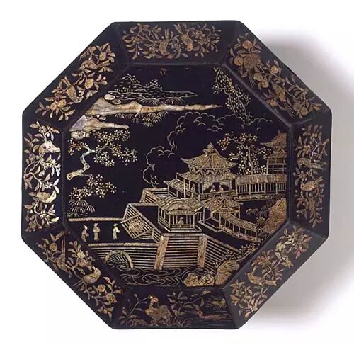 明嘉靖 戗金彩漆龙凤寿字纹八棱盘
