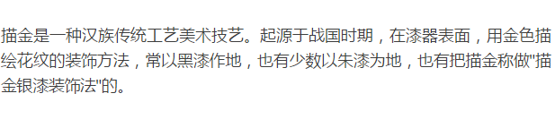 先在漆地上刻画出图案,于刻纹内上漆后,然后填以金银箔,效果极其富丽。