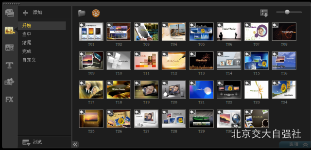 (2)素材库中就是能够让使用者充分利用的素材了,包括“色彩”、“转场效果”、“文字效果”素材库右下角的“选项”功能就是用来调整相关素材样式的;