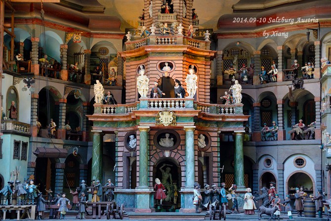 水力木偶钟前方也暗藏了喷泉,导游会趁人不备而突然按下开关,我自然也是躲避不及,幸好冲锋衣防水效果还不错。值得一提的是,这座水力木偶钟是1750年所建,距今已经有两百多年的历史了。
