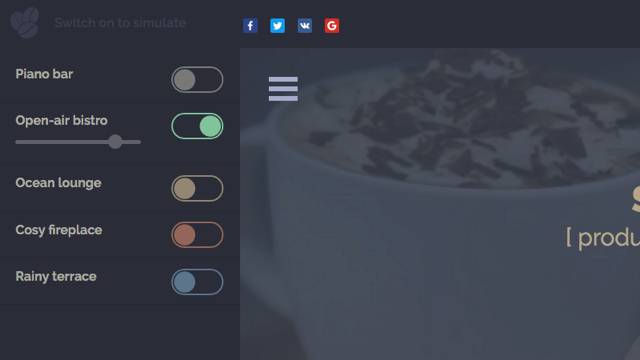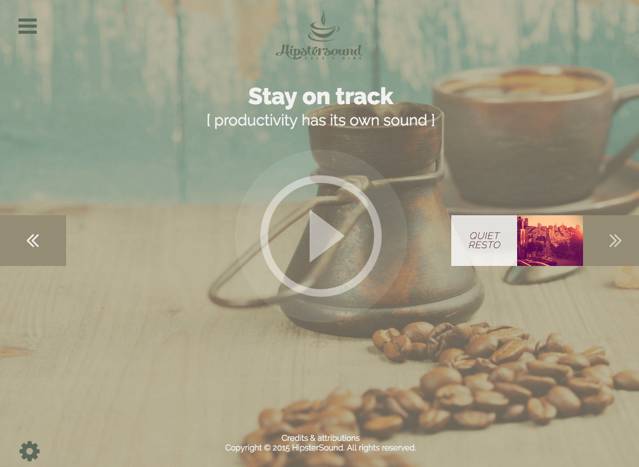 比较不同的是 HipsterSound 可以让使用者从左上角开启选单,来调整当前情境下应该要出现那些音效,例如你可以加入现场钢琴弹奏或下雨的声音,让整体音效呈现更加独特!