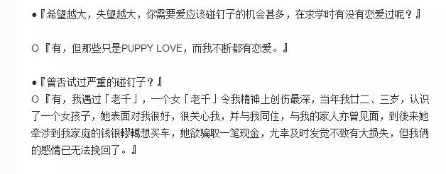 这里要说哥哥年轻时候的一件事来证明我说的所谓情感业力的问题。张国荣在一次访谈里谈到自己不断有恋爱(这其实犯了大问题,不断恋爱肯定对对方有不断的伤害,劈腿,换人难免造成业力)最后,他终于遇到一个女老千,骗了他很多钱。