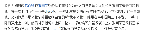 张国荣也会是一个比较有意思的人,有时候他说话还比较直接容易得罪人。这是因为其实内里他是一个脾气不是特别好的人(和善良没有抵触)他曾经也因为口直得罪过一些人。比如下图的一件事,他就得罪过陈百强。