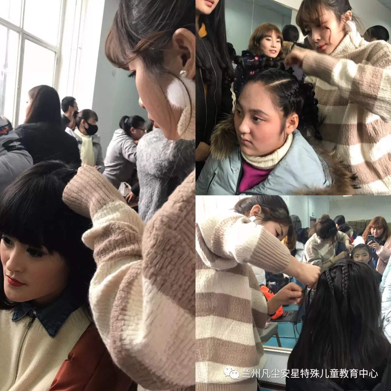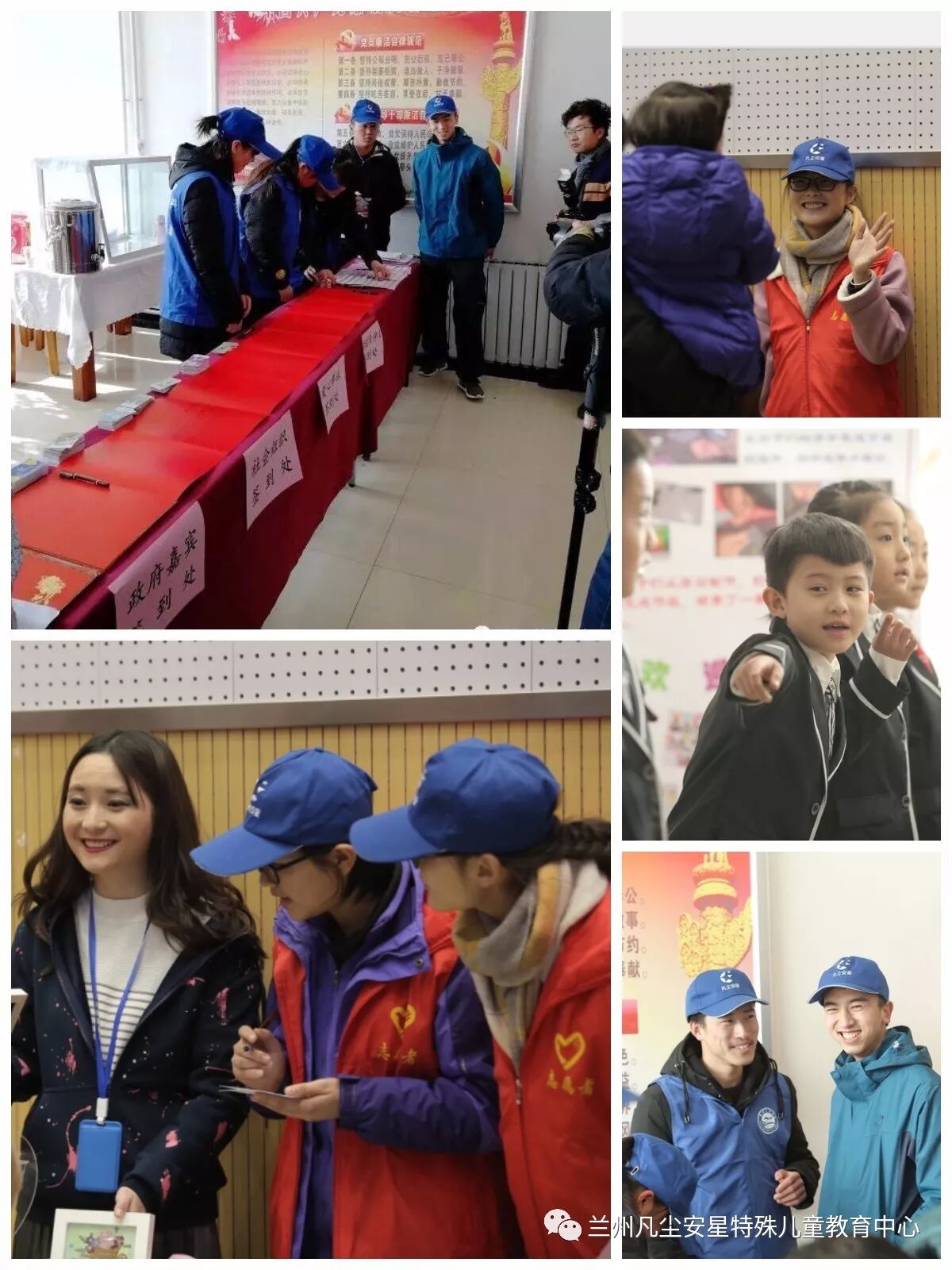 志愿者们早早从四面八方赶到联欢会现场:布场地布场,化妆地化妆,贴路标地贴路标……场外零下十几度,有些志愿者主动申请,要求去外面做引导员,会场外一公里,马路两侧随处可见的蓝帽子志愿者引导员……辅助催台的志愿者,一遍又一遍熟悉节目单,跟特教老师们沟通可能会出现的突发情况,一次又一次商量着备选方案,以保证整台联欢会的万无一失。幕后志愿者们,你们都是最棒的。