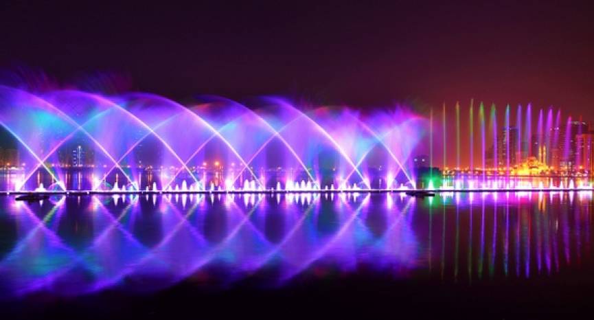 从人工湖吸水喷入高空后最终又落入湖中,覆盖面相当于两个足球场大小。在180多亩的人工湖上,水柱将高达150米,比一座50层的大楼还要高,是而今世界上最高的喷泉。