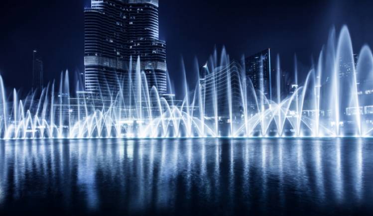 迪拜音乐喷泉位于迪拜哈利法塔旁边的人工湖上,是迪拜的又一标志性景观。