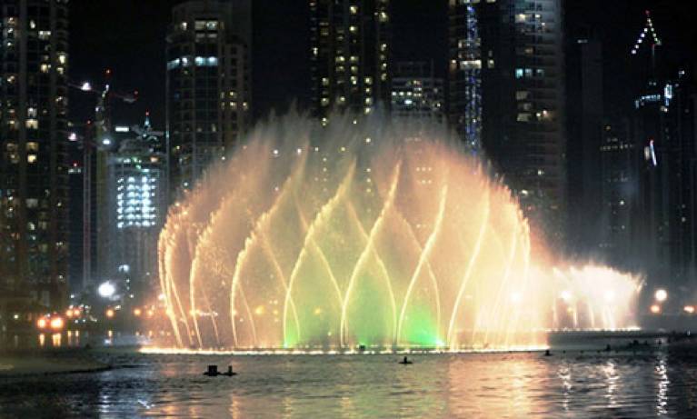 音乐喷泉表演开始,喷泉伴随着音乐而出,喷洒的水柱像是在人们面前跳着优雅的舞蹈,一会像一群苗条少女婀娜多姿、翩翩起舞;一会像一列武士整齐划一、高亢有力;一会喷出所有水柱气势磅礴、雄伟壮丽。尤其是在播放阿拉伯乐曲时,一排排打着细细的水柱,节奏时而欢快,时而缓慢。