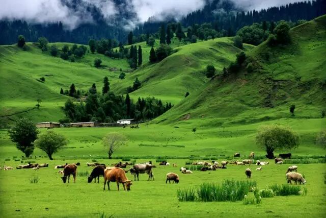五彩斑斓的花簇、点缀期间的白色毡房、绿毯上散布的流云羊群、墨绿的原始森林、深邃的大峡谷,配以天际的蓝天、白云和雪岭冰峰,构成一幅美丽绝伦的画卷!