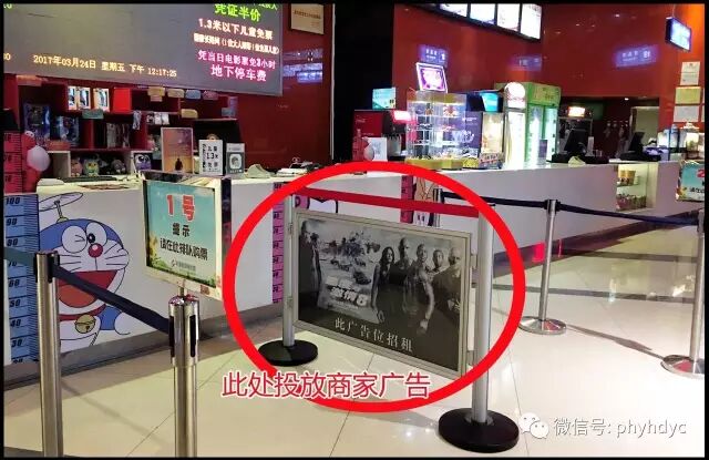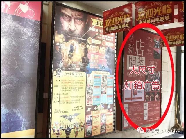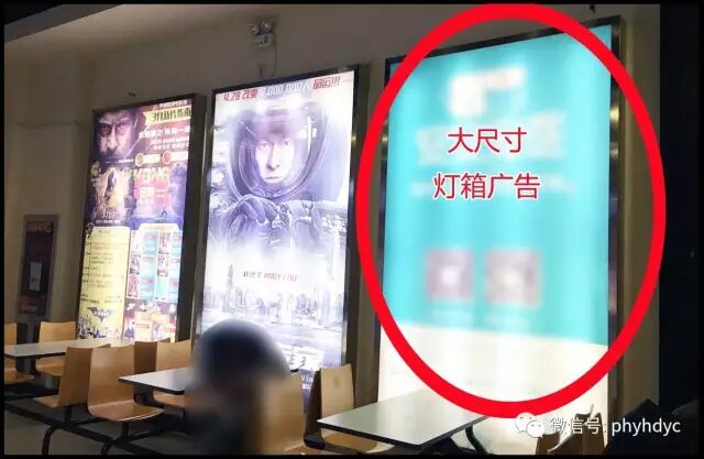 位于影城大厅显眼的位置,吸引来往顾客,广告灯片尺寸大,画面鲜亮容易吸引眼球。
