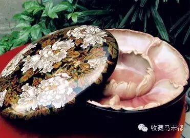 精选蚌、鲍鱼贝、夜光螺等优质贝壳作原料,经磨制成后,做成人物、亭台楼阁、花鸟鱼虫等图案,拼贴、镶嵌于漆胚上,再经髹漆、抛光而成。螺钿的历史非常悠久,相传起源于商代的漆器。至唐代,中国的螺钿工艺已达到相当成熟的地步,尤其是铜镜漆背螺钿,更是这一时期的工艺瑰宝。
