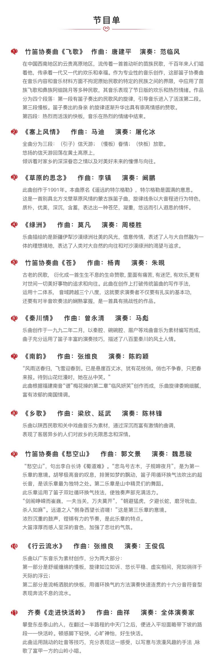 上午9:30--11:30 当代著名笛家代表性作品讲解,主要包括《千山情》《挂红灯》《流浪者之歌》《深秋叙》《牧民新歌》《秦川抒怀》《大青山下》《走进快活岭》等。