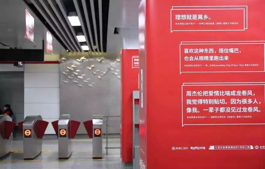 然而,我却被另一则广告击中,那就是网易云音乐在杭州地铁投放的铺天盖地的 红色广告 ,网易云音乐把乐评点赞数最高的5000条评论精选了一些金句贴到了杭州的地铁上,铺满了地铁1号线和整个江陵路地铁站,使得这个地铁站刷爆朋友圈,秒变旅游景点、情侣约会地、文青怀旧地……这个营销主题名字叫《看见音乐的力量》,我觉得它秒杀了“红苹果”。