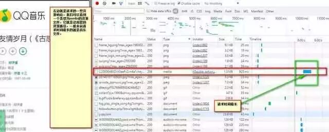 右边就是请求的一些资源响应,我们可以看到一个类型为media的资源文件,它就是这首歌的资源路径,一般来说请求时间最长的就是音乐文件。