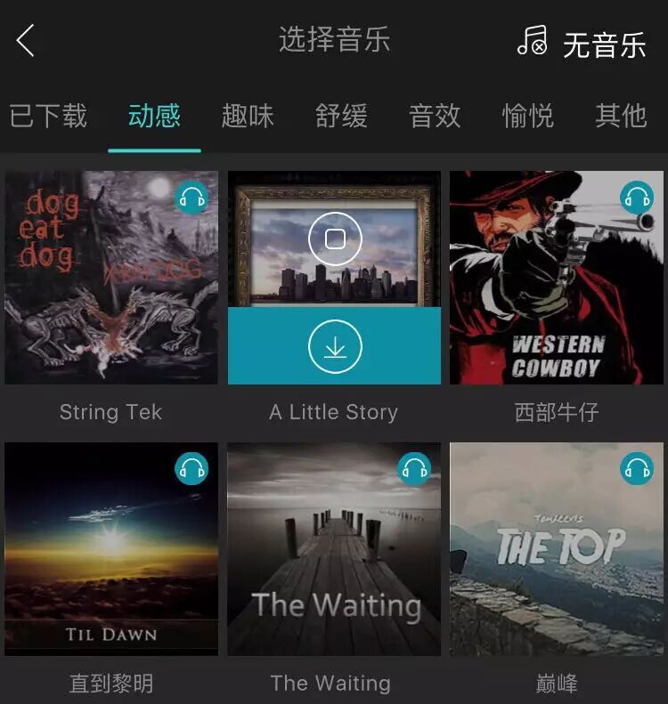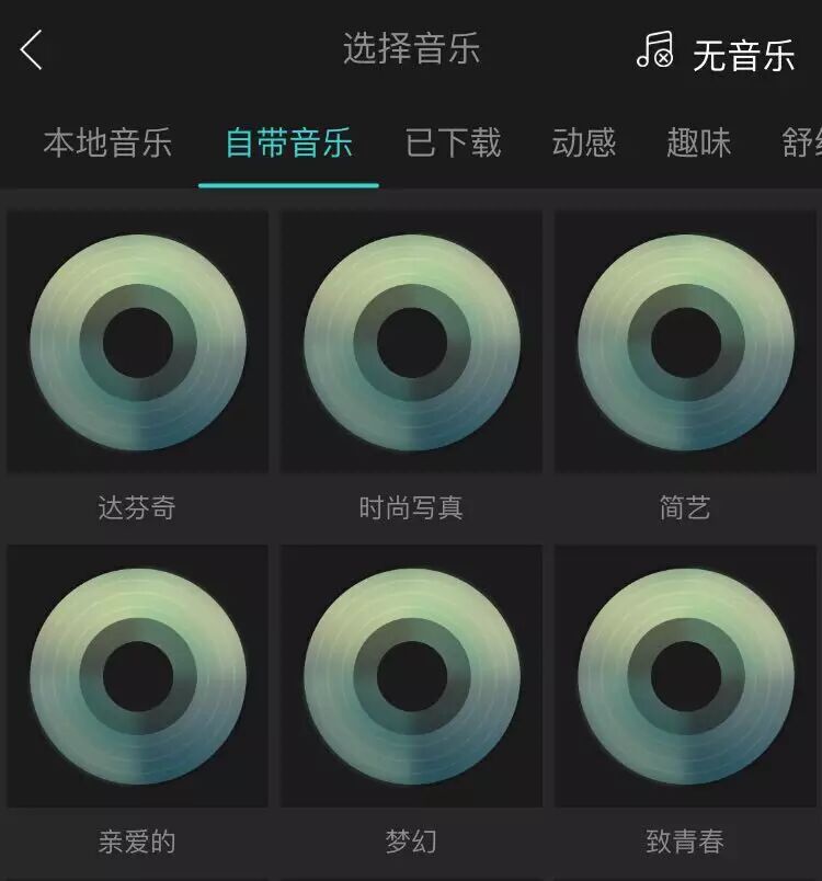 在编辑视频时选择音乐-背景音乐,就会进入到美摄的音乐管理界面。本地音乐为手机里原有的音乐;自带音乐为美摄自带音乐,共14首;已下载为从美摄音乐库中下载的音乐都会显示在这里;而已下载右边的动感、趣味、舒缓等则是音乐库的分类,每个分类下方都有很多音乐可供选择,目前美摄的音乐库中已收录115首音乐,包括(14首自带,31个音效,以及70首其它)