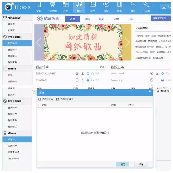然后点击音乐,会看到下面图片的界面,在这里可以下载音乐。不过我们目的是导入音乐,选择左方iPhone图标下的“音乐”点击进入,会提示选择文件还是文件夹,我们根据所需选择就可以了。