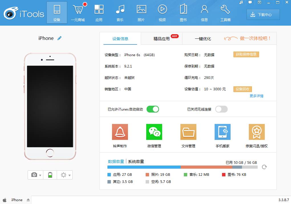 等待安装完成,然后用数据线将电脑和手机连接,iTools会在手机上自动下载手机版。手机版也安装完成并与电脑连接以后会出现下面这个界面,能看到你手机的一些状态信息。