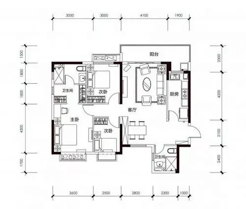 B户型,建面100㎡,三室两厅双卫