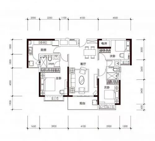 C2户型,建面:111.89㎡,三室两厅双卫