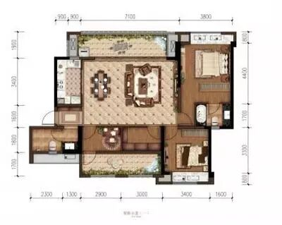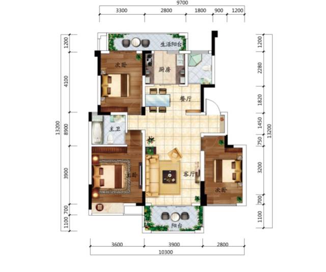 C3户型,建面103㎡,三室两厅双卫