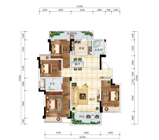 E3户型,建面135㎡,四室两厅两卫