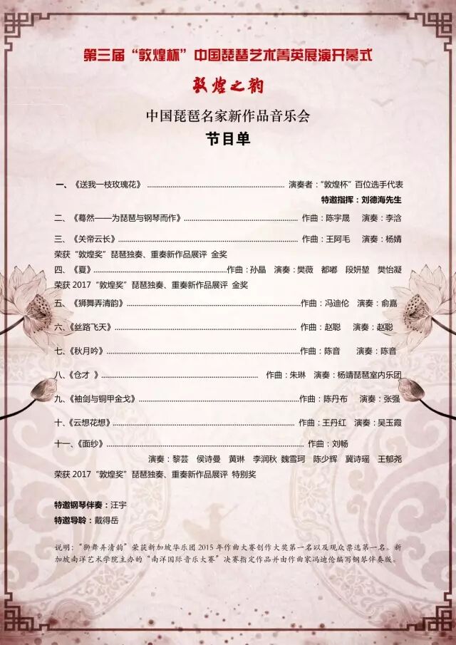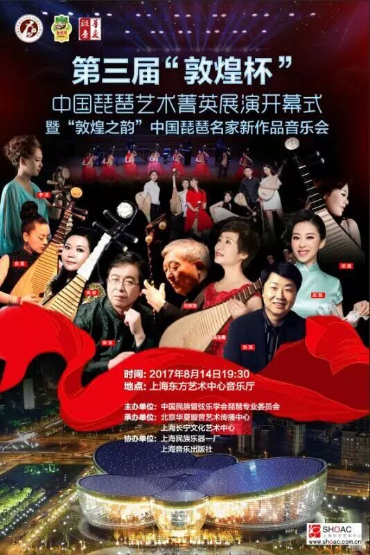 “敦煌杯" 琵琶艺术菁英展演开幕式暨“中国琵琶名家新作品音乐会”将于8月14日在上海东方艺术中心精彩绽放,特别邀请国乐大师刘德海先生继续三年之约带领百名选手重奏团开场揭幕,吴玉霞、陈音、张强、樊薇、赵聪、俞嘉等国内外著名琵琶演奏家携琵琶新作品崭新亮相,并邀请已成为青年演奏家的数位历届敦煌杯金奖选手展现“敦煌奖”展评作品,精彩纷呈。
