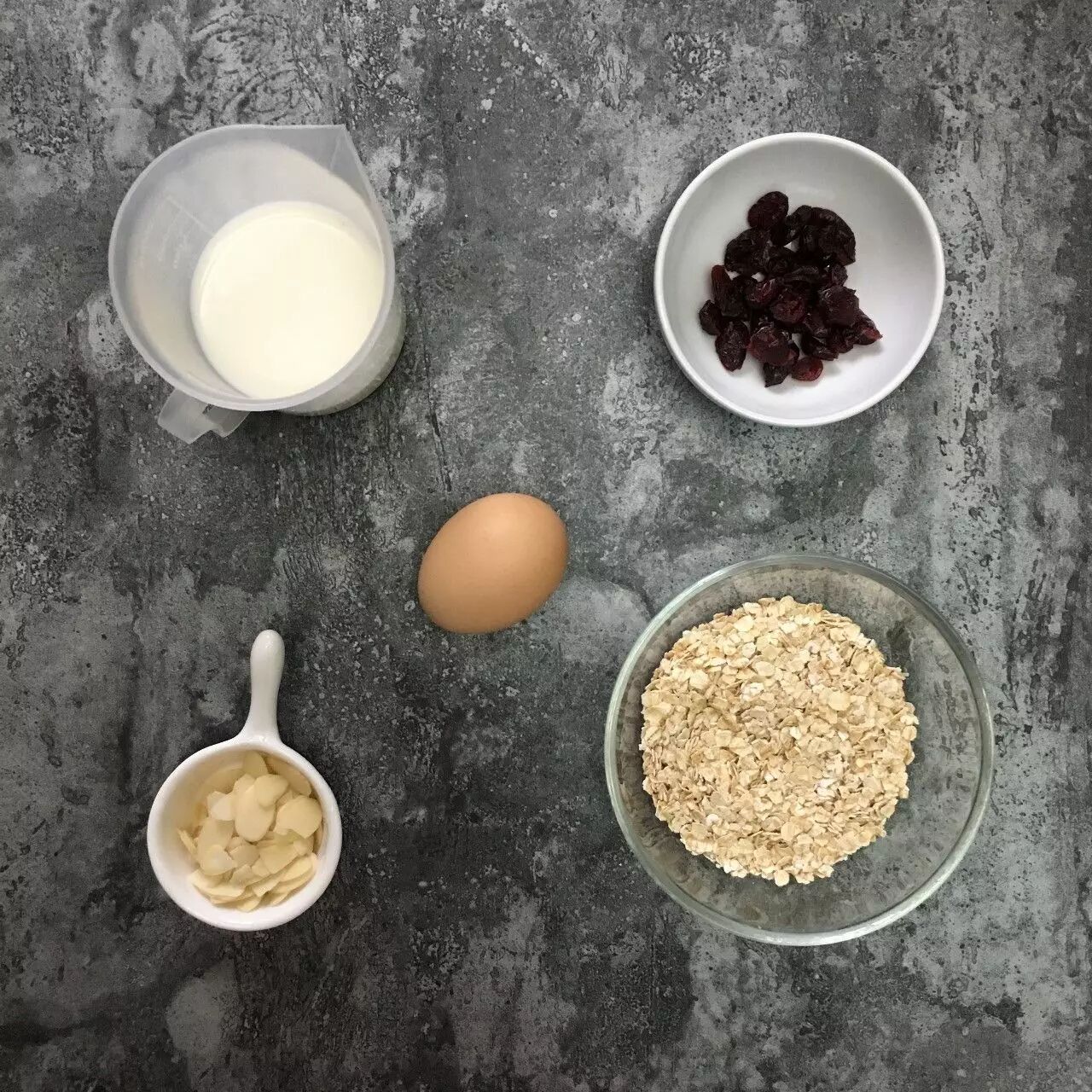 即食燕麦3勺 牛奶70克 鸡蛋1个 扁桃仁6克 蔓越莓干适量
