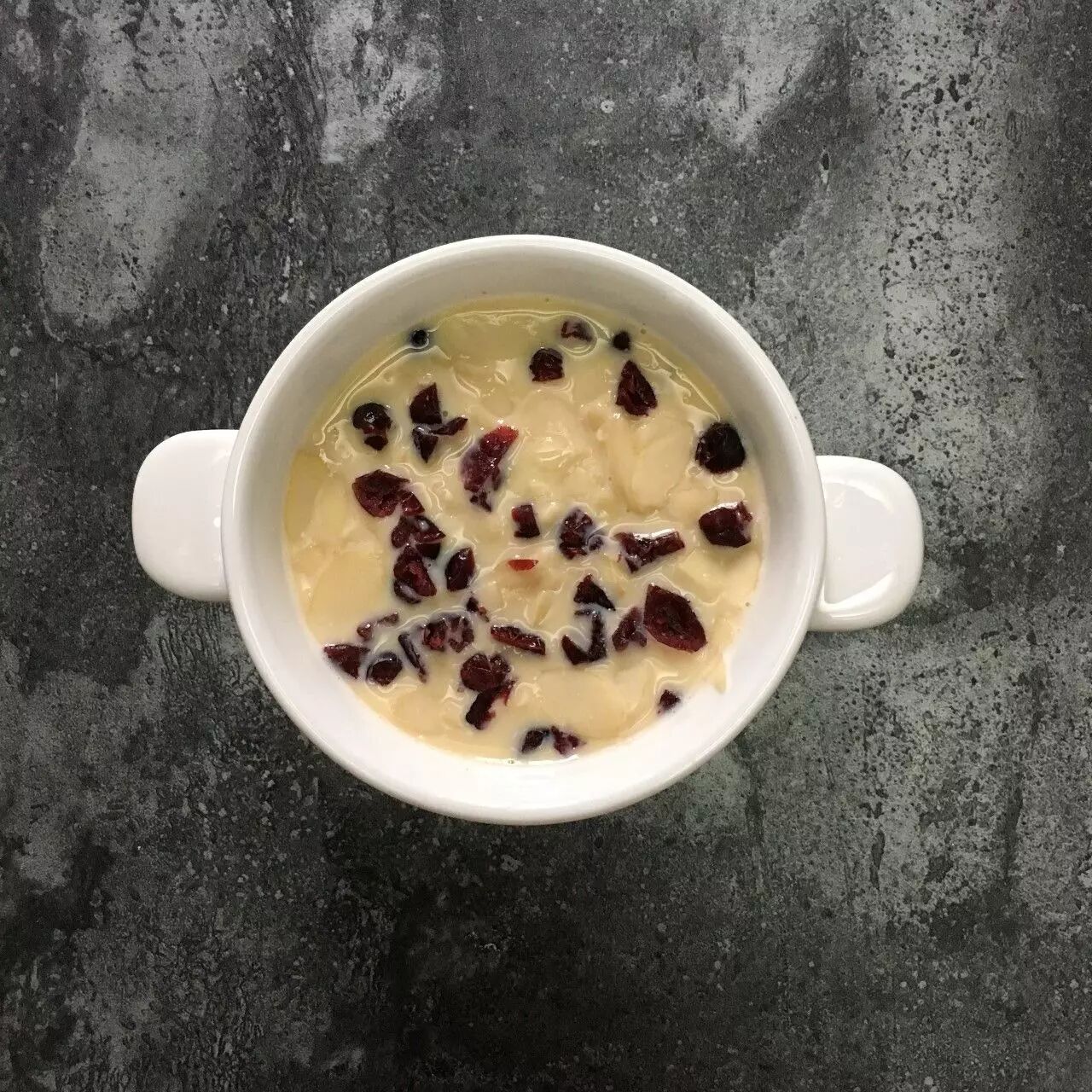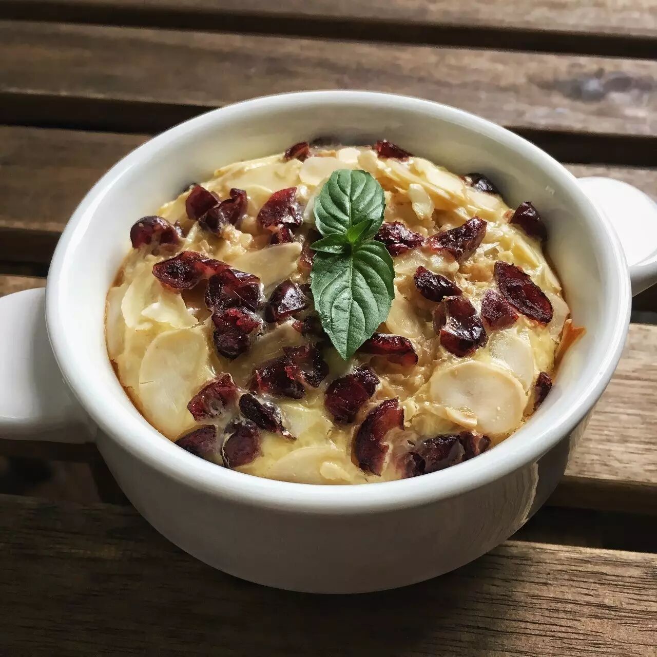 倒入焗碗,铺上剩余的扁桃仁和蔓越莓。