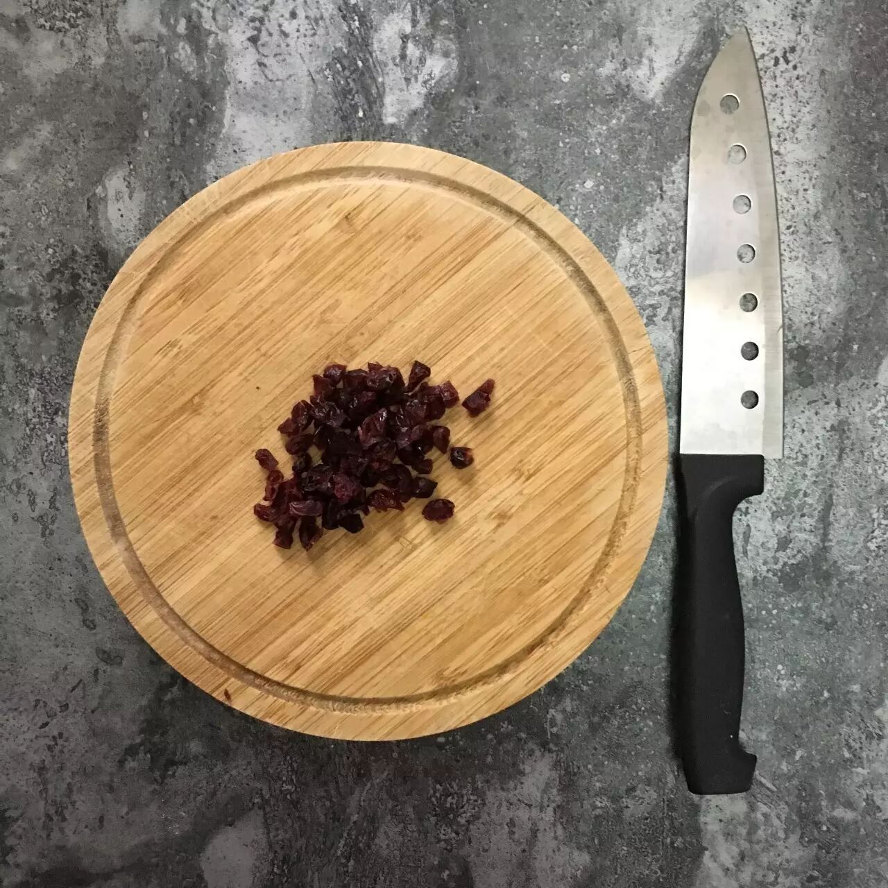 将蔓越莓干切碎。