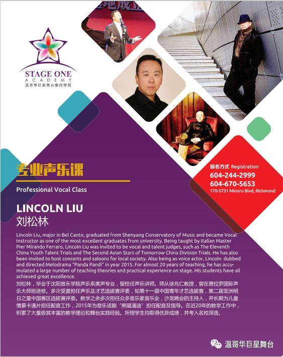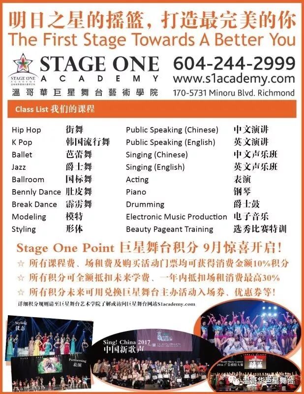 坐落在加拿大BC省列治文(Richmond)市的温哥华巨星舞台艺术学院成立于2009年,是集启蒙与艺术教育于一体综合性专业培训机构。巨星舞台长期致力于艺术人才的培养与挖掘,提供先进的设备、优良的师资、复合式的教材,拥有近万尺的室内空间。温哥华巨星舞台艺术学院重在培养3到18岁热爱艺术表演的青少年,学院从小就开始对学生进行多元化培训,提供舞蹈、声乐、播音、主持、表演等一系列的全方位打造课程,帮助每一位学员真正走向自信,从自己的小舞台走向世界的大舞台。 温哥华巨星舞台艺术学院连续多年承办、协办了国际知名大赛。不仅为学生提供了大量的实践机会,也为学生毕业后就业与再深造提供了良好的捷径。学院以“打造最完美的你”为目标,以特色教育打造品牌,以专业的演出活动推动文化产业的发展,让更多的巨星在舞台上熠熠生辉。 由加拿大PCTIA认证的职业艺术培训机构。学生在学院完成一定的课程以后,可以参加DVIDA国际专业舞蹈考试,通过者可获得国际舞蹈教师资格。