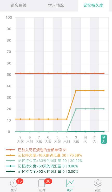 防遗忘曲线、学习情况、记忆持久度三个图表,会准确详细地统计你的背词能力以及记忆水平,还会给出合适的每日记忆单词记忆量。