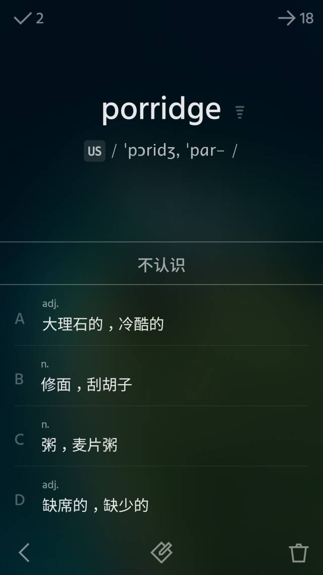你打开软件所出来的第一个界面就是背单词的界面,让你复习上次所背的单词,迅速进入状态。