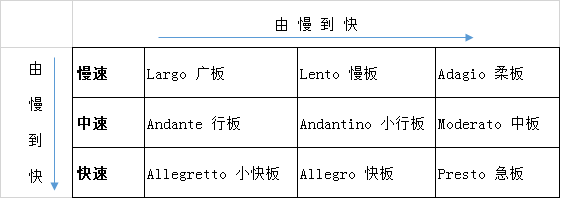 在一首曲子的开始之前,左上角一般会标注出一些单词,这些单词就是告诉你,这个曲子要用多块的速度去表现。