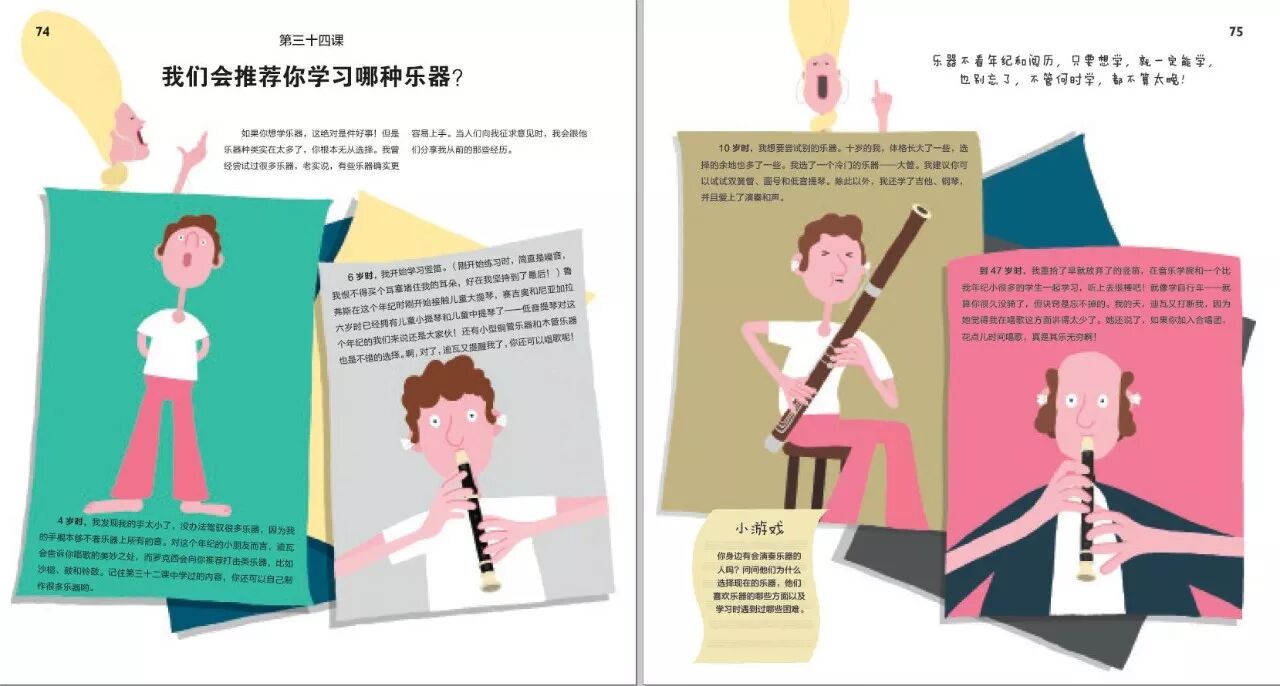 本以为大知识容量的书文字量一定很大,孩子们会不喜欢读。但本书融入绘本的形式,以大幅的插画代替文字拟人化的引入了六位教授的卡通形象,在他们的带领下,孩子们可以轻松的享受快乐音乐之旅。