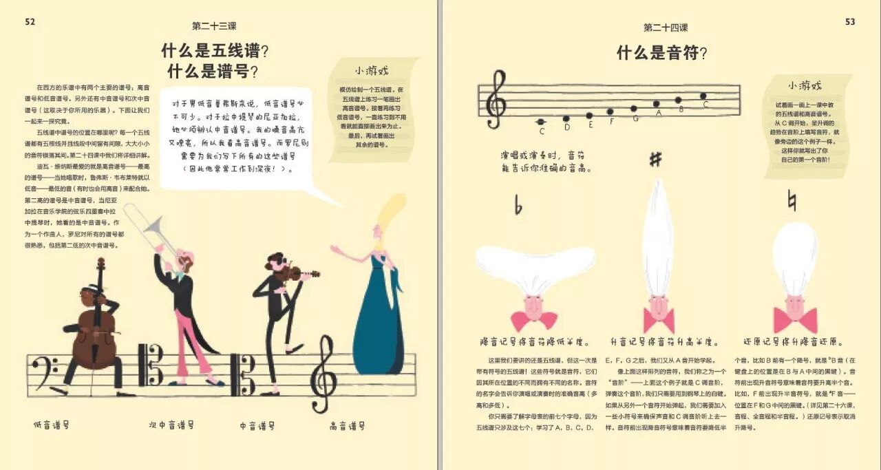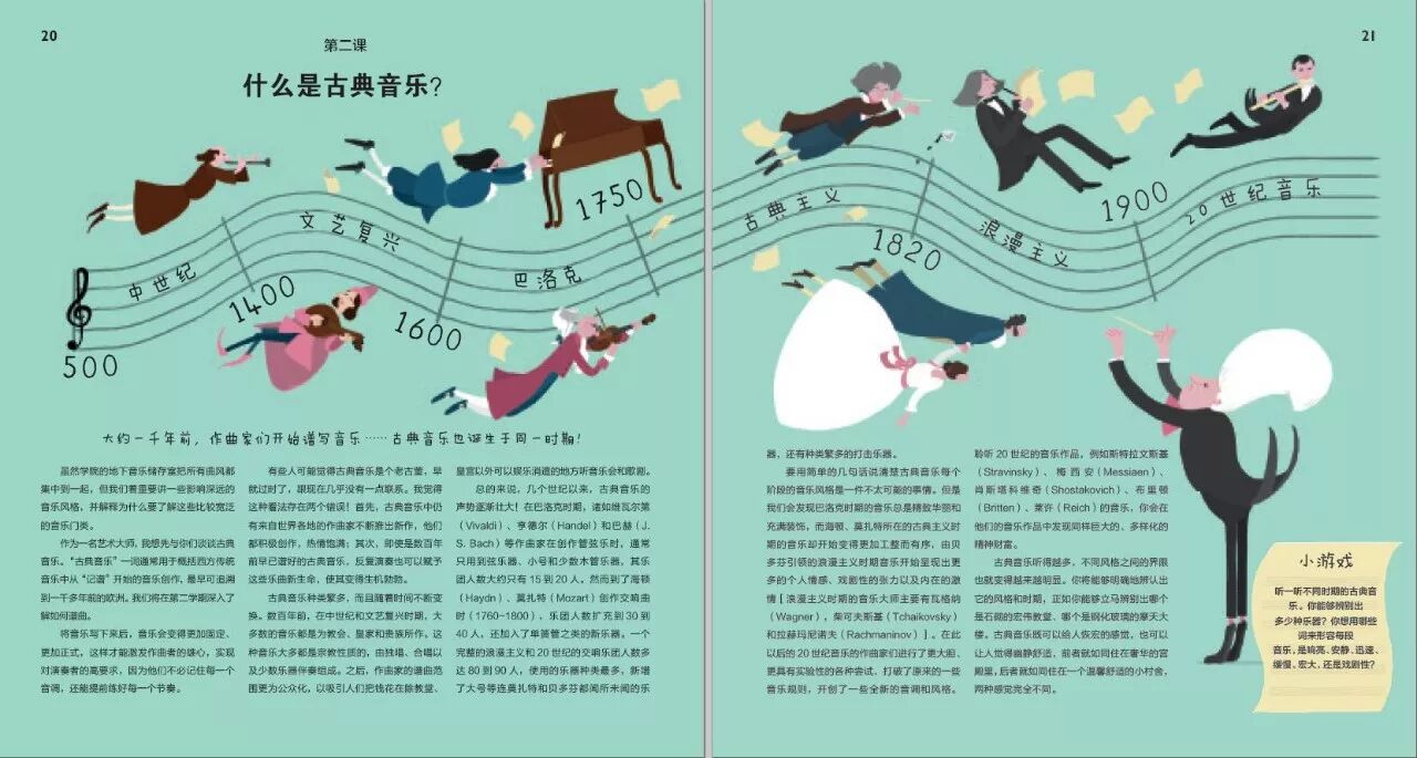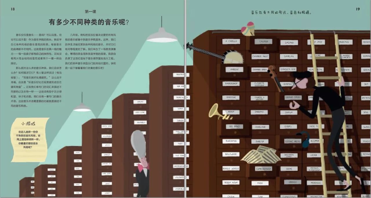 全书由浅至深的把音乐启蒙分为了三个学期,40堂课。严格按照英国儿童音乐教育的理念,内容按照“聆听—欣赏—解构—表达—创作”的规律编写。正如书名——《了不起的音乐学院》,读完后就像系统的上了音乐大学一般,整个音乐知识的逻辑和体系清楚明了。书中提到了几百种乐器种类,特别适合孩子拓宽视野,增长知识。