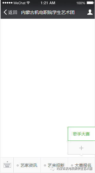 1、线上报名:微信关注“内蒙古机电职院大学生艺术团”或点击文章顶部蓝字关注,根据底部菜单栏提示完成报名