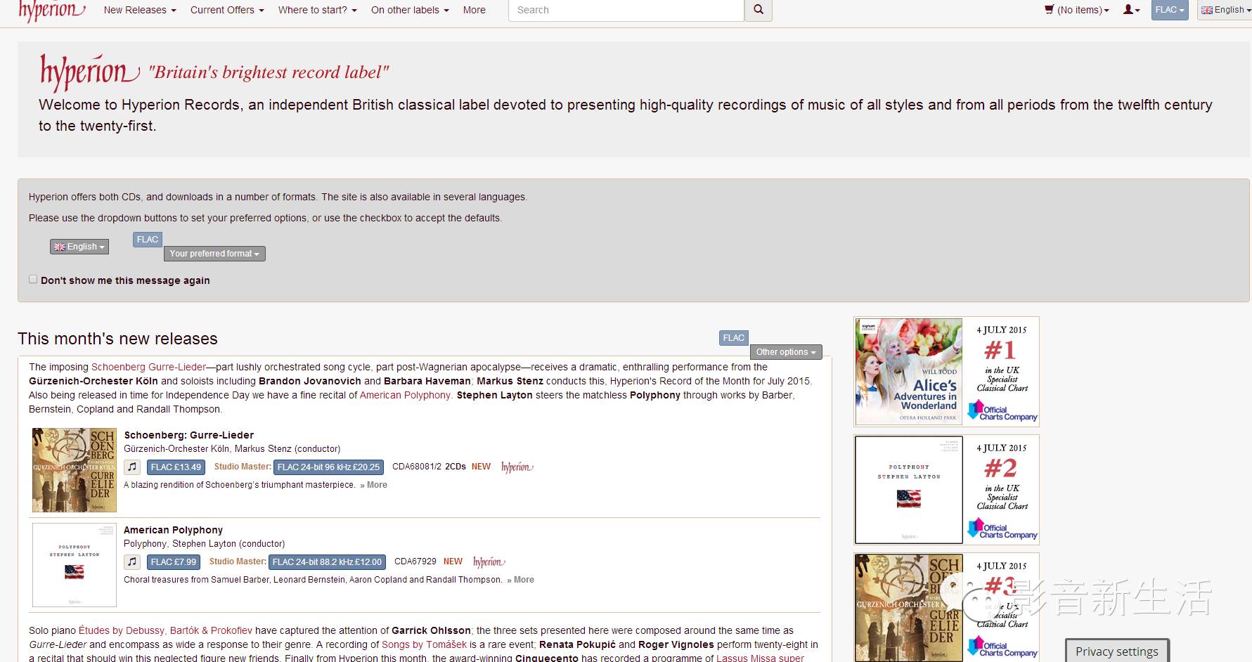 不像其他古典音乐唱片厂将母带交给HDtracks之类网站重制成高规格音乐文件并代为销售,Hyperion在自己的网站上进行这项工作,提供MP3、CD品质与高规格音乐文件付费下载,大部分曲目都可线上试听片段,网站上还有非常详细的曲目解说可以参考,经营的非常用心。