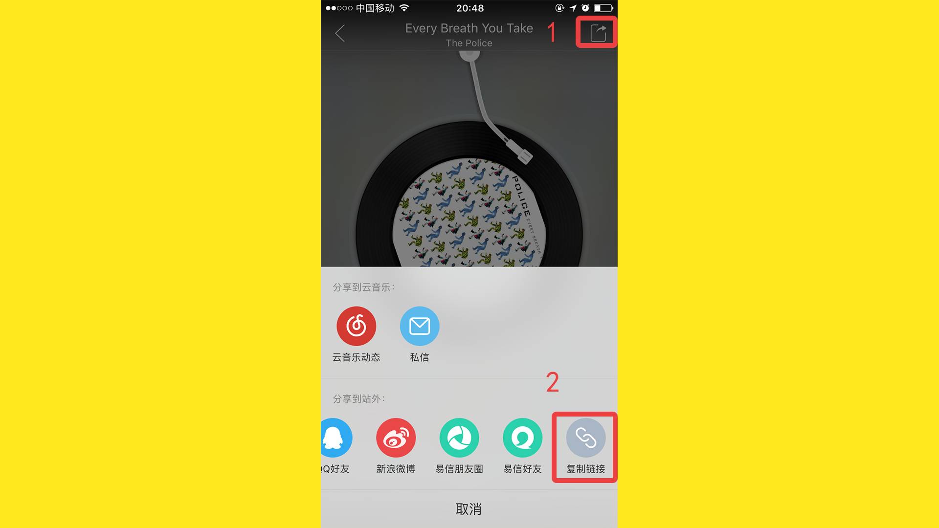 1、找到需要下载的歌曲,点击右上角分享,在分享菜单找到复制链接