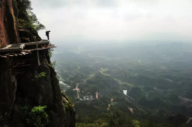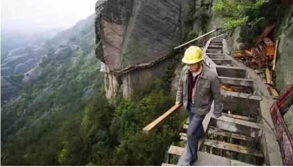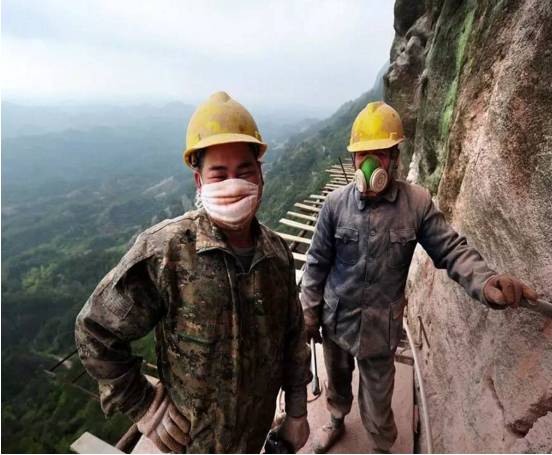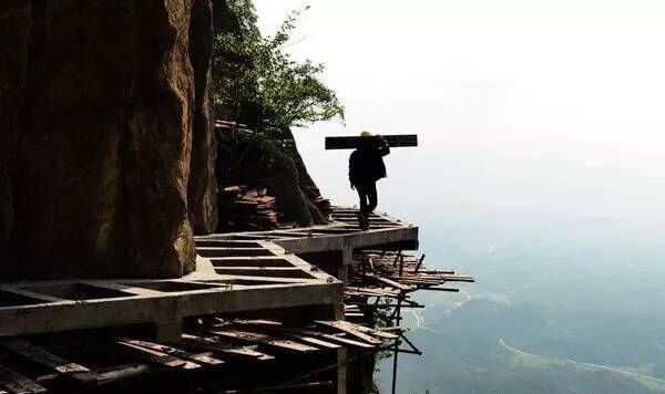 悬崖绝壁的栈道上,栈道工人们在上面来来往往,却如履平地。