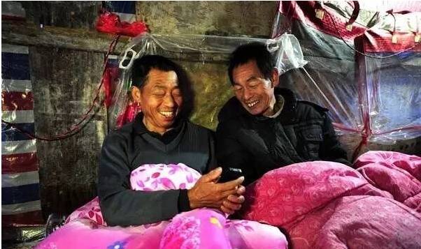 两名栈道工人们躺在床上给家里人打电话聊天。临时的工棚里,他们睡的是大通铺。