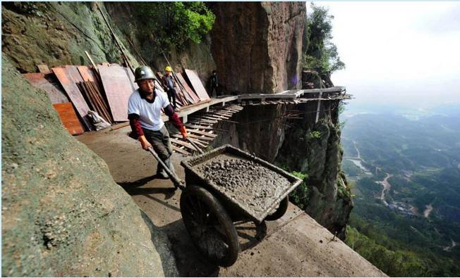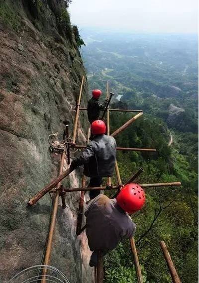 两名栈道工人在悬崖绝壁的栈道上进行混凝土浇筑倒模施工,待水泥干后,下面的支架才可撤除。