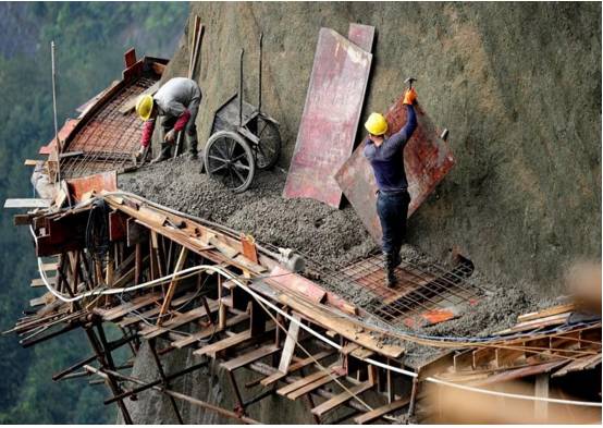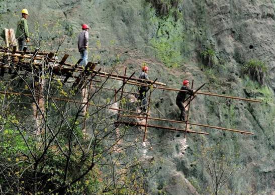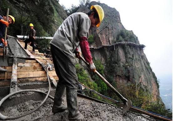 栈道工人在悬崖绝壁的栈道上进行混凝土浇筑倒模施工,待水泥干后,下面的支架才可撤除。