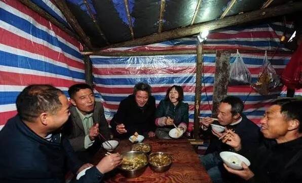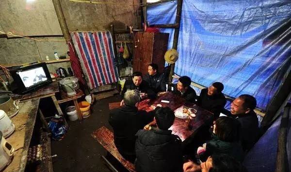 栈道工人们在一起吃晚饭,他们一餐就三个菜,虽然艰苦,却很开心。