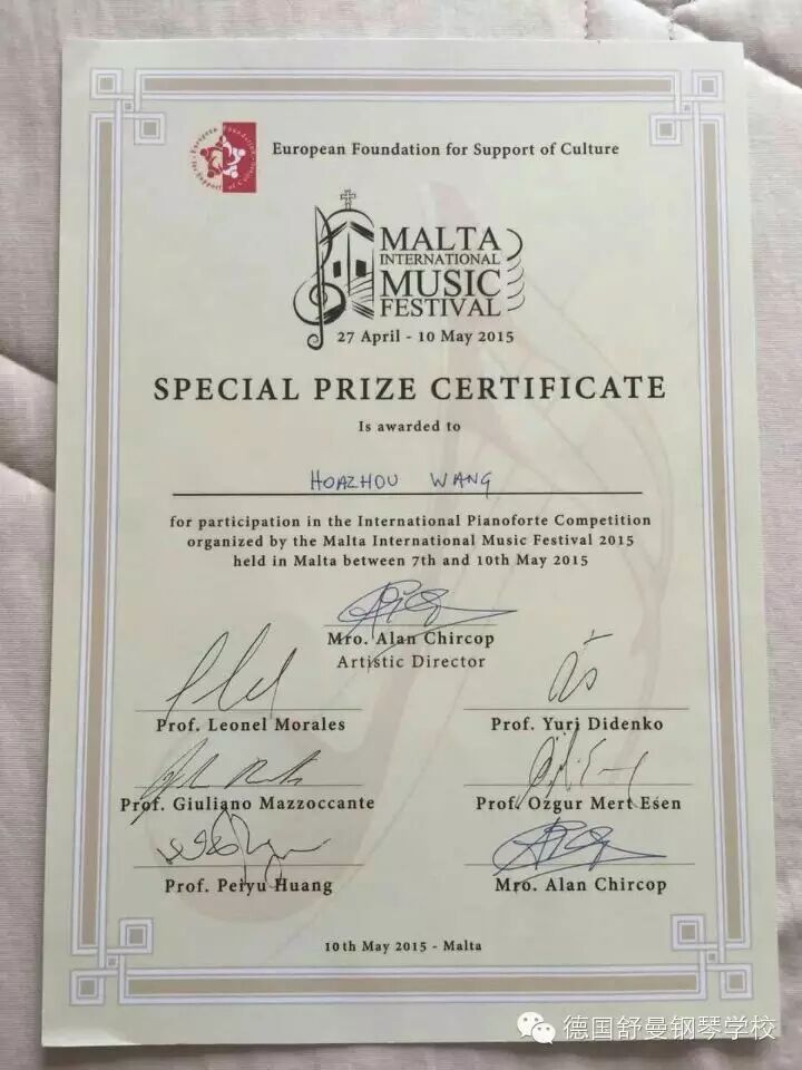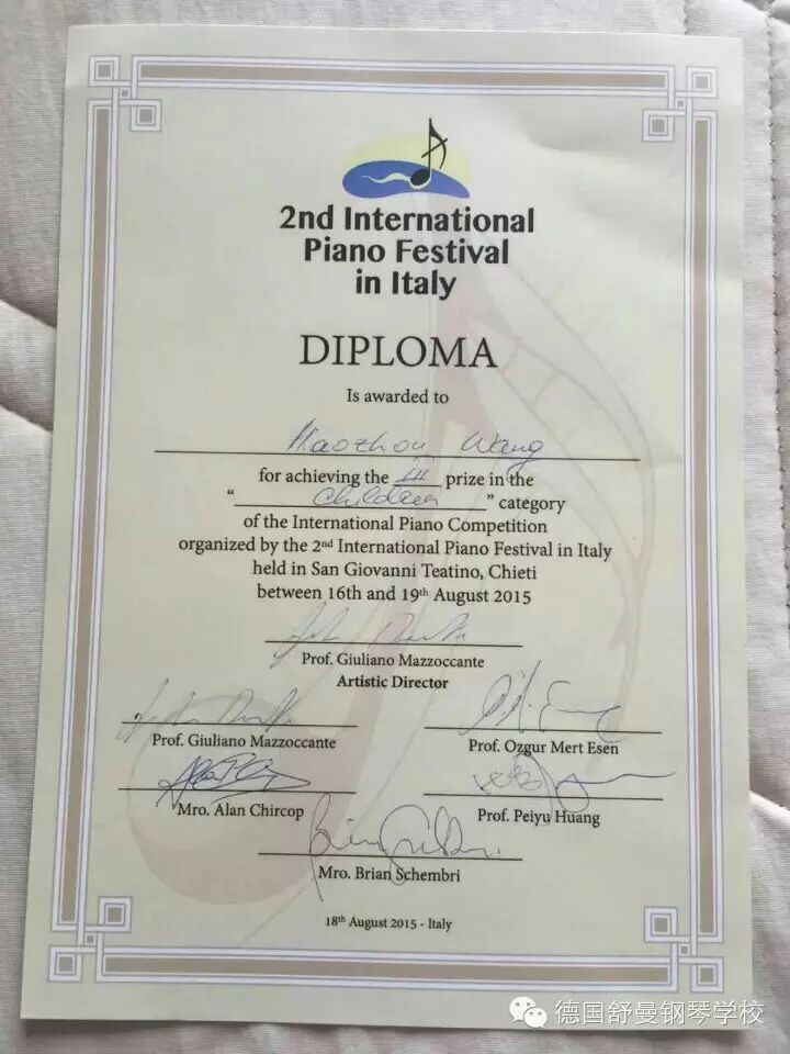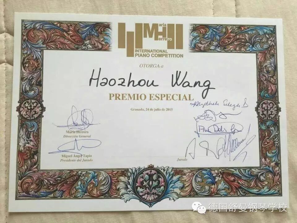 德国舒曼钢琴学校国际获奖优秀学生-王浩舟简介: