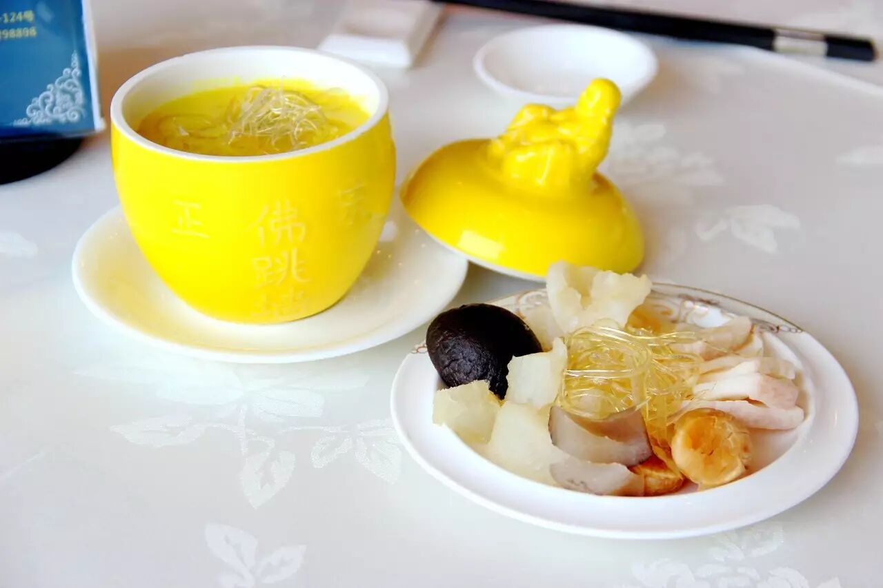 佛跳墙选用多种海味产品和少许肉类原料,盛入特制瓷坛内长煨时间制而成,荤香可口、不油不腻、补肾、补血、滋补强身,有很高的食疗价值
